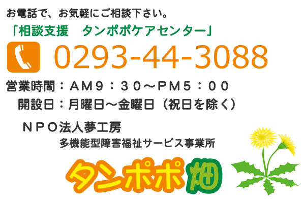 障害のある方や、ご家族の生活や支援に関する相談に応じるとともに、関係機関との連携の下、地域において安心して生活できる支援体勢を作ることを目的としています。